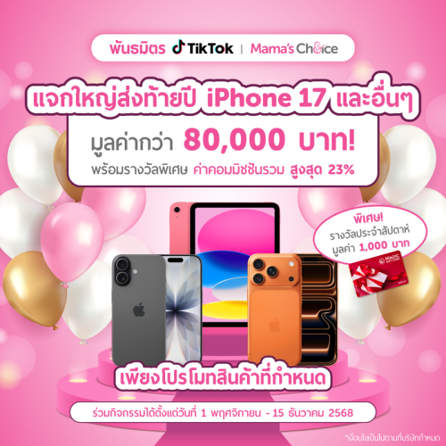 - บริษัทฯ จะเลือกผู้ชนะจากพันธมิตร Tiktok 3 ท่าน ที่มียอดขายสูงสุดในช่วงระยะเวลาจัดกิจกรรม โดยผู้ชนะกิจกรรมอันดับที่ 1 จะเป็นผู้ร่วมกิจกรรมที่มียอดขายสูงสุดรับ iPhone 17 Pro 256GB ผู้ชนะกิจกรรมอันดับที่ 2 รับ iPhone 17 256GB และ อันดับที่ 3 รับ iPad 2025 128GB